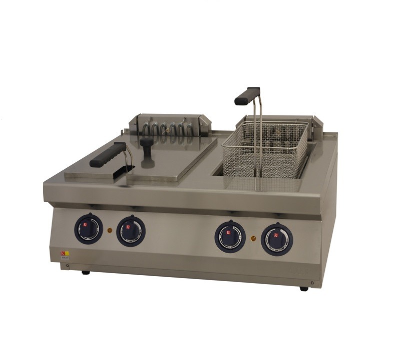 Rozsdamentes acél váz és burkolat, hideg-zónás kialakítás, könnyű tisztíthatóság, Felhajtható fűtőszálak 22,2kW, vagy 28,2kW teljesítménnyel, beépített olaj leeresztőcsap vízszíntes, vagy függőleges kivezetéssel, olajkapacitás 2x13-15 liter, Kosár méret 2x230x405x120 mm SzéxMéxMa