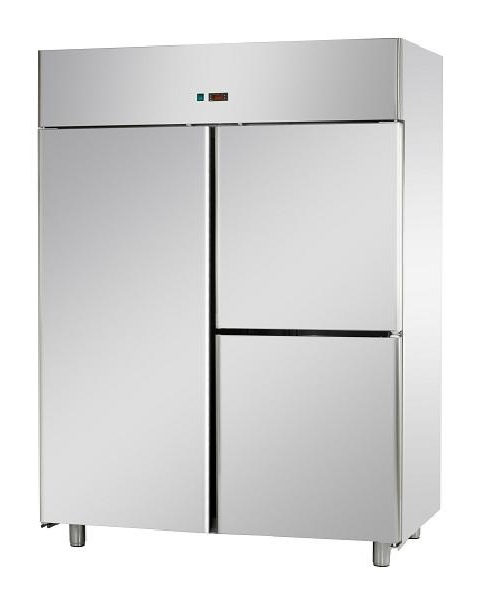 Ventilációs hűtésű három részre osztott ipari hűtőszekrény kettő fél és egy teljes, önműködően záródó ajtóval rendelkezik, melyeknek nyitási iránya megfordítható. Külső és belső rész rozsdamentes acélból készült, kivéve az alját, a tetejét kívülről és a hátoldalát, amelyek galvanizált acélból készültek. Belső lekerekített sarkokkal, elektronikus elülső panel NTC szondával, automatikus leolvasztással és kondenzvíz párologtatással, valamint állítható rozsdamentes acél lábakkal rendelkezik.