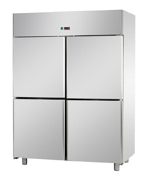 Ventilációs hűtésű négy részre osztott ipari hűtőszekrény négy fél, önműködően záródó ajtóval rendelkezik. Külső és belső része rozsdamentes acélból készült, kivéve az alját, a tetejét kívülről és a hátoldalát, amelyek galvanizált acélból készültek. Belső lekerekített sarkokkal, elektronikus elülső panel NTC szondával, automatikus leolvasztással és kondenzvíz párologtatással, két kompresszorral, valamint állítható rozsdamentes acél lábakkal rendelkezik.