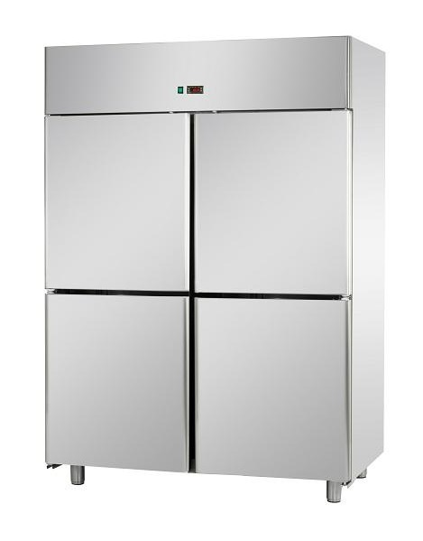 Ventilációs hűtésű négy részre osztott ipari hűtőszekrény rozsdamentes acél burkolattal, lekerekített szélekkel és állítható lábakkal. Négy fél, önműködően záródó ajtóval rendelkezik, melyeknek nyitási iránya megfordítható. A hűtőszekrény automatikus leolvasztással, digitális hőfokszabályzóval van felszerelve.